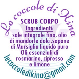 sale integrale fino, olio di mandorle dolci, sapone di Marsiglia liquido puro, oli essenziali di rosmarino, cipresso e limone.